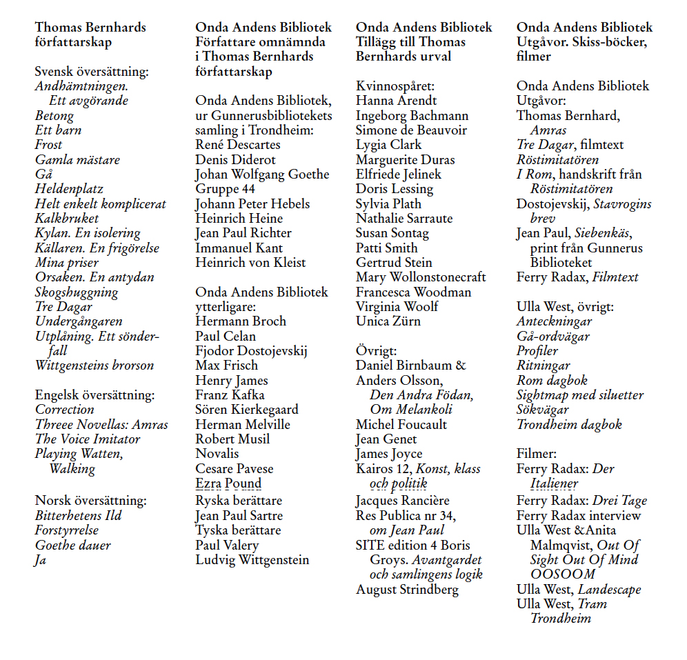 I read all the novels of Thomas Bernhard and I follow his literary tracks as if these traces are clues, as if I may solve a mystery. Like a detective. Curiosity guides me. I can’t stop myself. I wonder how and if I can activate and update or perhaps reinterpret and visualize Thomas Bernhards so called Library of the Evil Spirit, from the novel Extinction.