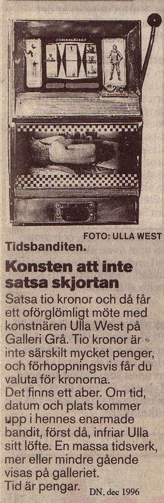 One game with the One Armed Bandit at the cost of 10 sek and the money goes undivided to the artist and for the gamer: a hope of changes like to win a piece of art, to win a breadloaf, to win a friend in work, to win good luck and a better future.